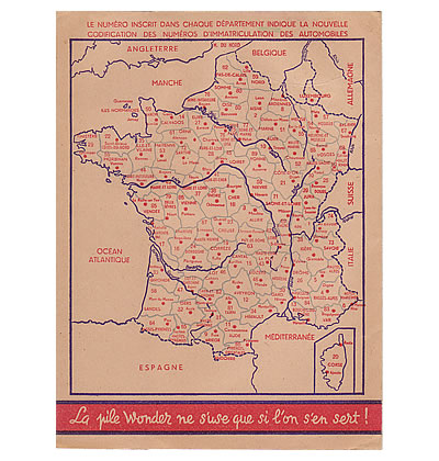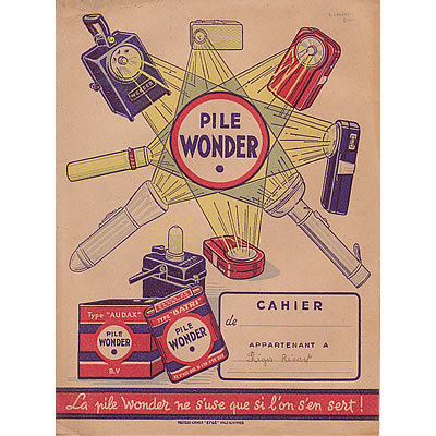 懐中電灯・電池メーカーPILE WONDERの広告プロテージュカイエです。シミ、サインがありますが、破れなどはなく状態は年代モノにしては良い方です。裏表紙には、フランスの地図、折り返しは、曜日ごとの時間割を書けるようになっています。様々な懐中電灯のイラストがキュートなカイエです。