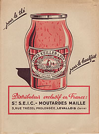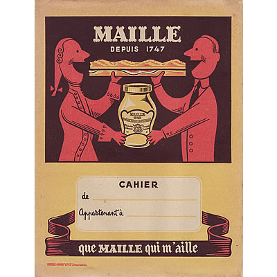モルヴァン氏デザインのフランスの伝統あるマスタードで有名なMAILLE社の広告プロテージュカイエが再入荷しました。シミがありますが、破れや落書きはなく状態は年代モノにしては良い方です。ムッシュとマダムが、仲良くサンドを頬張る表情が何ともいえないカワイサ!