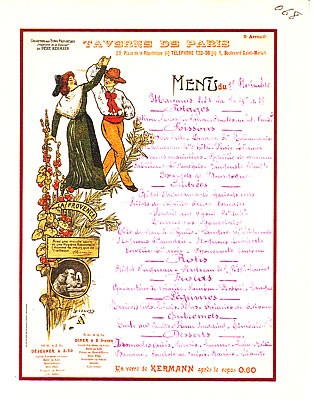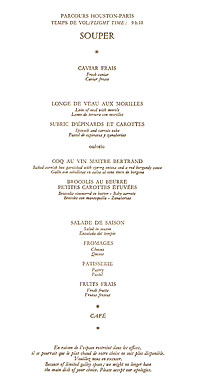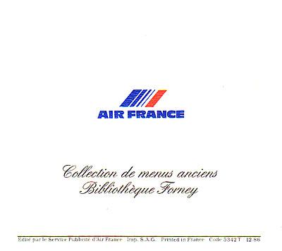 年代の古いエールフランスのメニューです。パリ−メキシコ間のメニューで、ファーストクラスのものと思われます。表紙上に数字の書き込み、少し汚れが見られますが、中のメニューは非常にキレイです。ムッシュとマダムが楽しそうに踊っているイラストが素敵です。