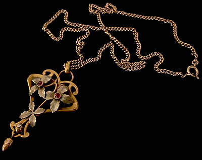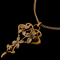 アールヌーボーを彷彿させる柔らかな曲線美がなんとも素敵なペンダントです。花の中心には小さなガーネットが2石埋められています。