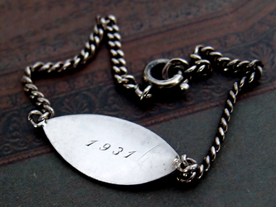 1931年頃に製作された、シルバー製(チェーン金具に猪の刻印)のアンティークのベビー用ブレスレットです。