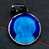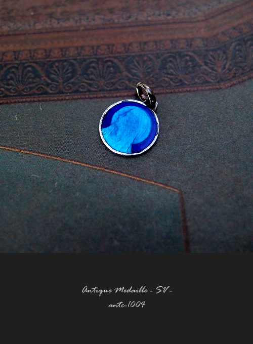 、聖母マリアが描かれた、とても小さなシルバー製のアンティークメダイです。