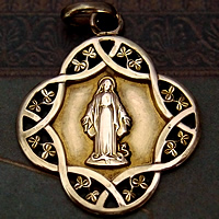 1926年頃に製作された、繊細な透かしデザインのフレームと、丁寧に描かれた聖母マリアが印象的なアンティークメダイです。