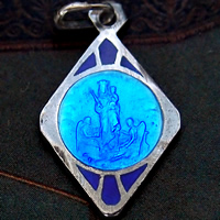 、とても繊細で美しいブルーエマイユで描かれた、フランス北部の町(ブローニュ・シュル・メール(Boulogne sur Mer)の聖母子(Notre Dame de Boulogne/ブローニュの聖母)が描かれた、大変希少なシルバー製のメダイです。