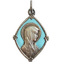 背景のターコイズブルーが魅力なアンティークチャームです。スクエアプレートの角部分にあるお花がポイント。裏面にルルドの刻印が入っています。