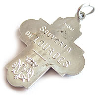 とても色鮮やかなブルーが印象的なアンティーククロスチャームです。フレーム内の4つのデザイン素適で、とてもキレイです。裏面には聖地LOURDES(ルルド)の刻印が入っています。