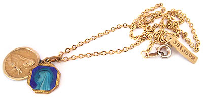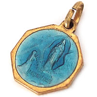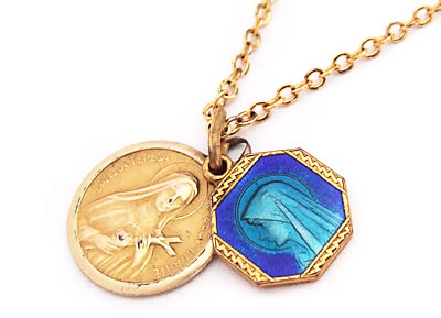 色鮮やかなブルーとゴールドのツートンカラーが印象的なアンティークチャームです。ゴールドのフレームには細かいカッティングが施されているなどとても丁寧な仕上がりです。裏面には【LOURDES】の刻印があります。