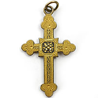 まるで美術品の様な繊細なデザインが印象的なアンティーククロスです。残念ながら中央の花の箇所に欠けがあります。