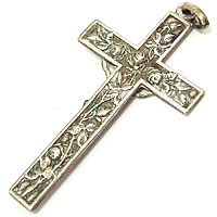 シンプルな表面の装飾とは相まって、裏面のバラや四つ葉のクローバーの繊細な彫刻が印象的なアンティーククロスです。