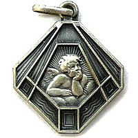 中央に描かれた頬杖をつくエンジェルがとても可愛いアンティークチャームです!