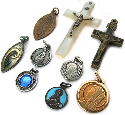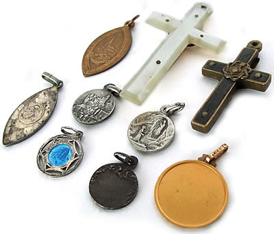 大小様々に趣の異なったデザインのアンティークメダイ7点とアンティーククロス、シェルクロス2点の計9点セットです。経年により燻された古きよき時代を彷彿させるメダイやクロスが中心の素敵なアンティークチャームのセットです。