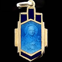 シャンパンシルバーのフレームに、表裏ともに施されたブルーのエナメルとステンドグラスを彷彿させる斬新なデザインが印象的なアンティークメダイです。