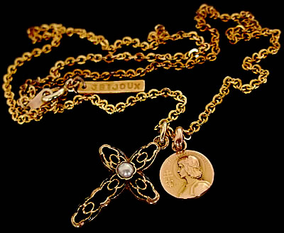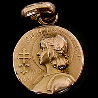 1920〜30年頃に製作されたK18製(OR750/18金製)のジャンヌ・ダルクのアンティークメダイです。