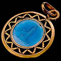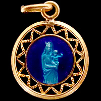 繊細なフレームのデザインと、ゴールドとブルーのコントラストが素敵なアンティークメダイです。