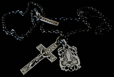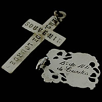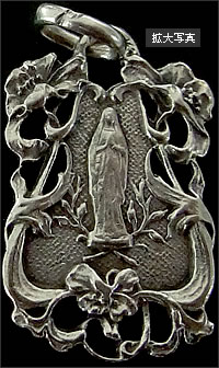 セットのアンティークメダイはアール・ヌーボー期を彷彿させる繊細なデザインが印象的で、裏面にはクロスと同様に【Lourdes】の刻印があります。