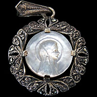 1900年代中期頃に製作されたフランスのシルバー835製とマザーオブパールのメダイが印象的なアンティークチャームです。