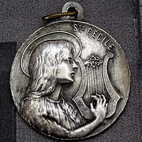 1900年代初期頃に製作された、音楽家の守護聖人として有名な「聖セシリア」の美しいレリーフが印象的なアンティークメダイです。