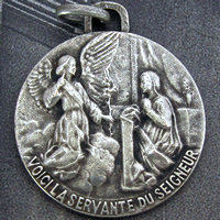 1900年代初期頃に製作された繊細に描かれた受胎告知(大天使ガブリエルと聖マリア)のレリーフがとても美しいアンティークメダイです。
