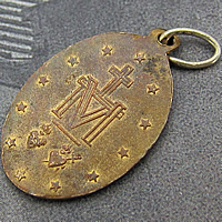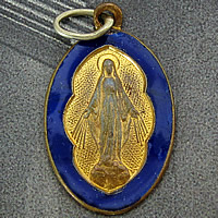 1900年代初期頃に製作された濃紺の七宝フレーム装飾が印象的なアンティークの不思議のメダイです。