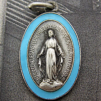 1900年代初期頃に製作されたスカイブルーの七宝フレーム装飾が印象的なアンティークの不思議のメダイです。