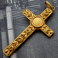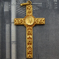 1900年代初頭に製作されたゴールドカラーのアンティーククロスです。繊細なバラの装飾が印象的で、クロス中央にはイエス・キリストが描かれています。