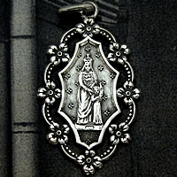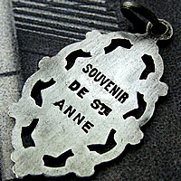 1900年代初期頃に製作されたシルバー製の美しいフレーム装飾が印象的な、聖アンナと聖母マリア(聖母子)が描かれたアンティークメダイです。