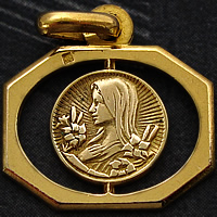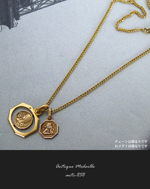 1900年代初期頃に製作されたとても珍しいフレーム形状と小さいながらも繊細に描かれたレリーフが印象的なゴールドコーティング製(フレームに刻印)のアンティークメダイです。
