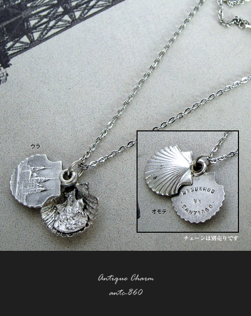 巡礼のシンボルであるイタヤ貝モチーフのチャームの中面には「馬上の聖ヤコブ像」や「サンティアゴの巡礼記念」 の文字が刻まれてあります。