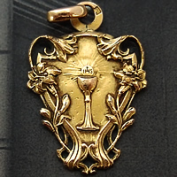 1900年代初期頃に製作された、アールヌーボーを彷彿させる繊細なフレームデザインによって聖杯が描かれたゴールドコーティング製のアンティークメダイです。