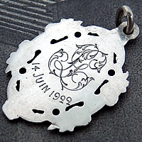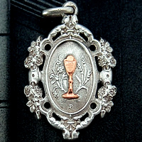 1922年頃に製作された、アールヌーボーを彷彿させる繊細なフレームデザインによって聖杯が描かれたシルバー製のアンティークメダイです。