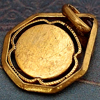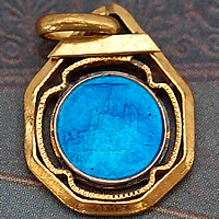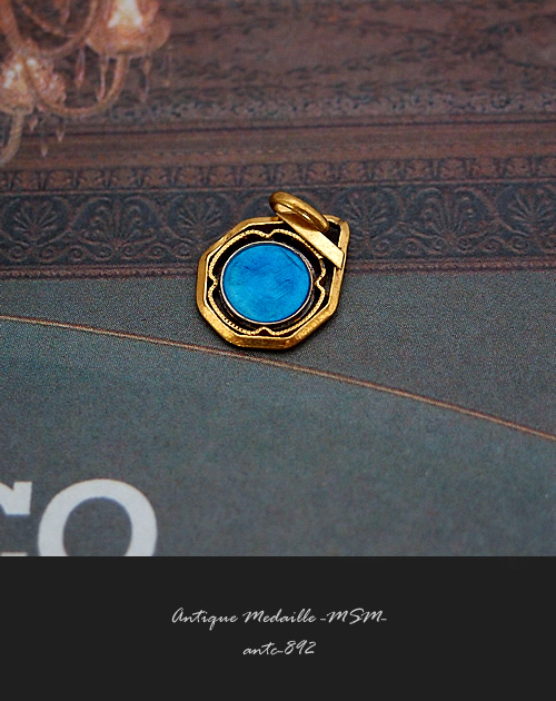 フランスの世界遺産「モンサンミッシェル」で見つけたモンサンミッシェル修道院が描かれたブルーエマイユと、ゴールドのミルグレインのフレームが素敵なアンティークメダイです。