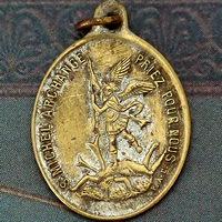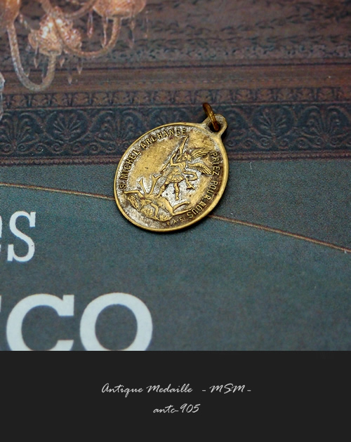 フランスの世界遺産「モンサンミッシェル」で見つけた大天使ミカエルをモチーフの、経年により燻されたゴールドコーティングが印象的なアンティークメダイです。