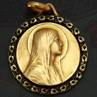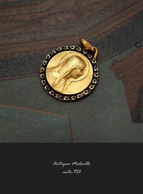 1900年代中期頃に製作された、繊細なフレームデザインととても美しい聖母マリアのレリーフが印象的な18金コーティング製(FIX刻印)