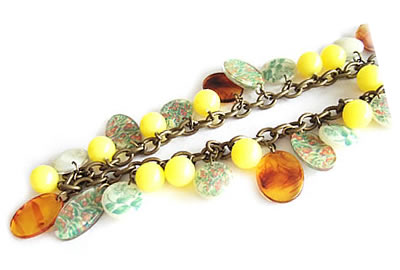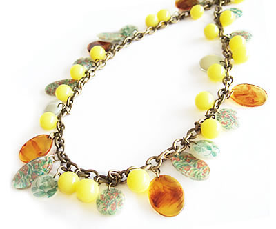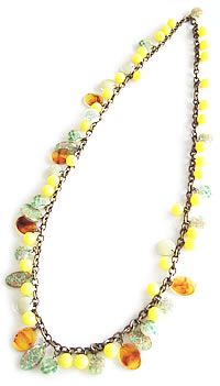 イエロー色のビーズがたくさんついたキュートなN2のネックレスです。どのビーズも色味が非常に美しく、ボリュームがあります。ロングネックレスなので留め具がありません。同素材のイヤリングと一緒に身につけると素適です。
