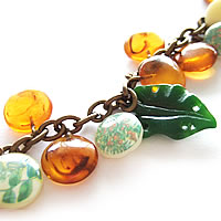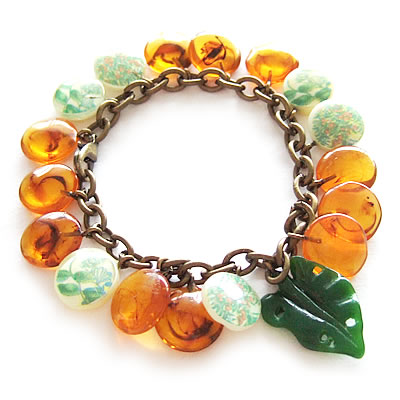アメ色のビーズがたくさんついたキュートなN2のブレスレットです。ほんのりマーブルがかったビーズがとてもキレイです。 葉っぱと、お花模様のビーズがアクセントになっています。同素材のネックレスと一緒に身につけると素適です。