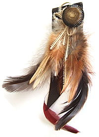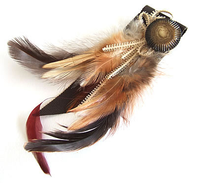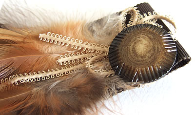 様々な種類の羽根をメインに使用し、アンティーク釦やアンティークレースでアクセントをつけたエレガントなブローチです。お気に入りのトップス・帽子・バッグのポイントとして身につけると素適ですね。