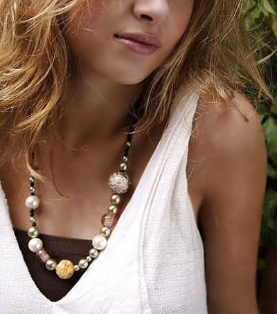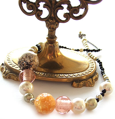 グリーン色のパール調ビーズをメインに、ガラスビーズとあわせたエレガントなネックレスです。同シリーズのブレスレットやピアスと一緒にコーディネートすると素適です♪