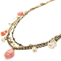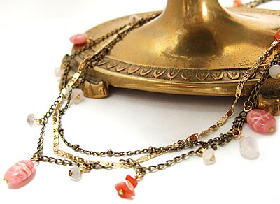 ピンクのマーブルストーンやクリスタルビーズがたくさん付いた【Eric et Lydie】のとっても素適な3連ネックレスです。異なる種類の3本のチェーンがエレガントさを醸し出しています♪