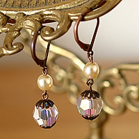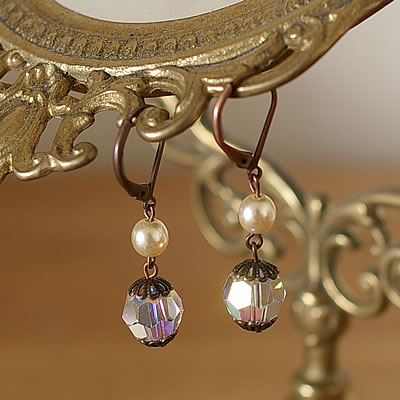 パールビーズとスワロフスキーのクリスタルビーズの組み合わせがとても素敵な【NADINE DELEPINE】のピアスです。