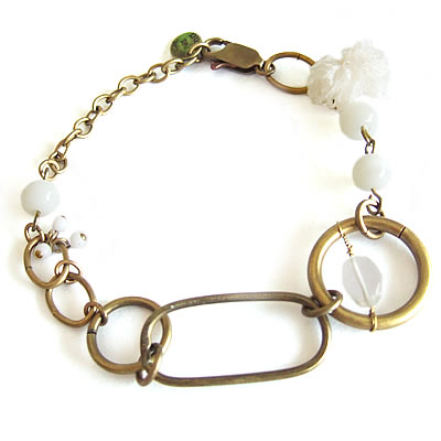 チェーンが連なった【Médecine Douce】のブレスレットです。ホワイトコットンのポンポンやビーズがポイント。フランスらしいデザインで魅力的です。