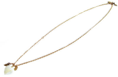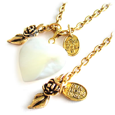 ハート型の天然石チャームがとっても美しい【elia stone】のネックレットです。マルカンが、チェーンの途中に付いているので、下画像の様に2通りの付け方が出来ます。ゴールドのバラのチャームもポイント。