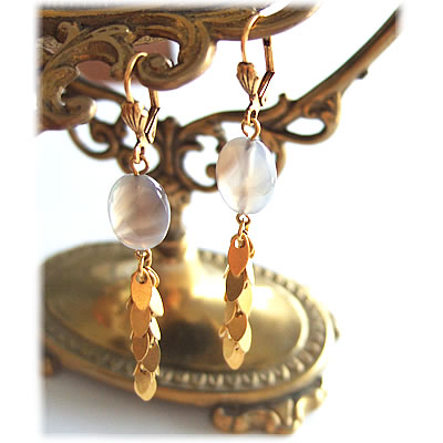 グレーの天然石チャームとっても美しい【elia stone】のピアスです。ストーンが多面的にカッティング(左画像)されていて、とても魅力的なピアスです。