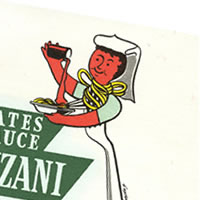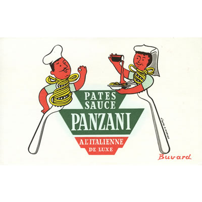 モルヴァン氏がデザインした、パスタソースでおなじみPANZANIの広告宣伝用ビュバーです。目立ったシミ、オレもなく状態◎マダムがムッシュの為にパスタにソースをかけているのかな。