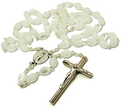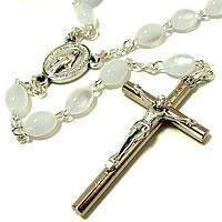 パリの教会で見つけた乳白色のホワイトビーズと、連結部分に使用された不思議のメダイが素敵なロザリオネックレスです。