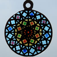 チャームを空(光)にかざすと、本物のステンドグラスの様に薔薇窓が綺麗に浮かび上がります(下写真参照)。