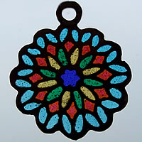 チャームを空(光)にかざすと、本物のステンドグラスの様に薔薇窓が綺麗に浮かび上がります(下写真参照)。