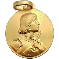 フランスの国民的英雄であり、聖女でもある「ジャンヌ・ダルク」が描かれたゴールドカラーのメダイ(Lサイズ)です。