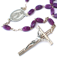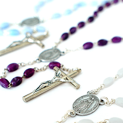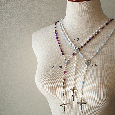 パリの教会で見つけた鮮やかな水色、パープル、ホワイトのそれぞれのビーズが素敵なロザリオネックレスです。