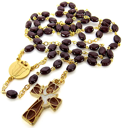 パリの教会で見つけたこげ茶色のビーズとデザイン性のあるクロス部分が素敵なロザリオネックレスです。連結部分にはサクレクール寺院が描かれています。