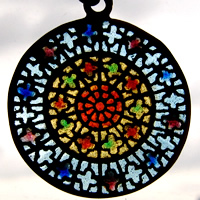 チャームを空(光)にかざすと、本物のステンドグラスの様に薔薇窓が綺麗に浮かび上がります(下写真参照)。